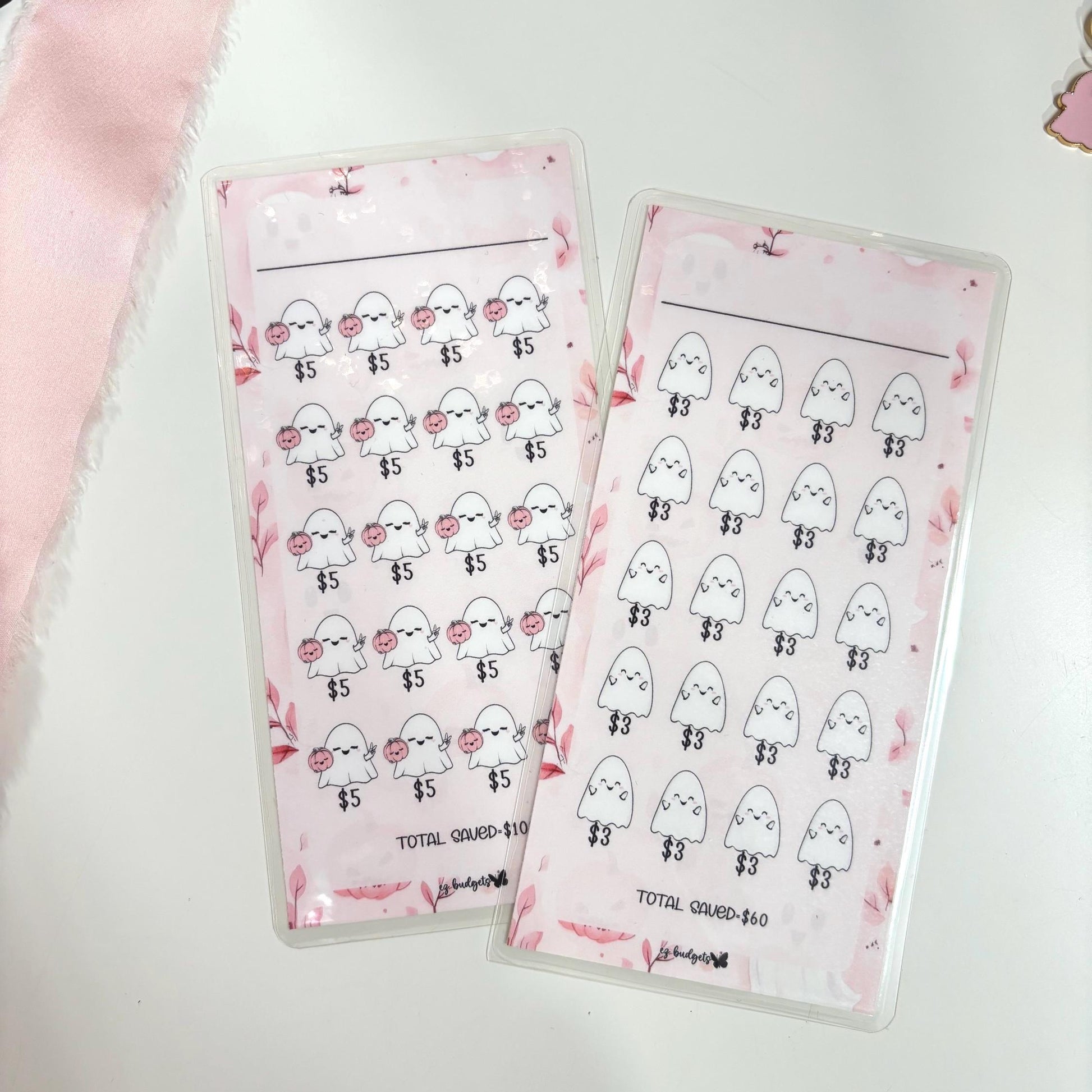 Save for spooky season in style! These adorable Halloween savings challenge cards are the perfect way to stay motivated while budgeting. Featuring pink ghosts, pumpkins, and floral accents, each tracker is laminated and designed to fit in your A6 binder.